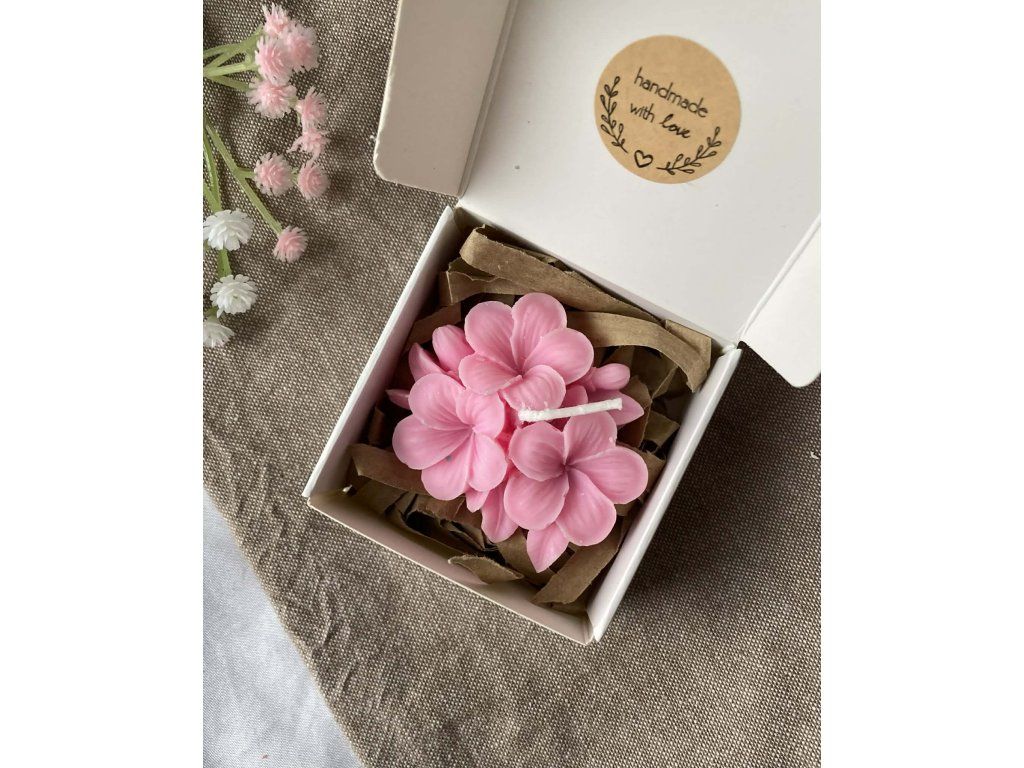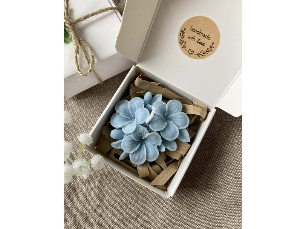Plovoucí svíčka ve tvaru hortenzie, dárkově zabalená, vyrobená z přírodního sójového vosku. Rozměry krabičky: 6,5 × 6,5 × 3 cm.