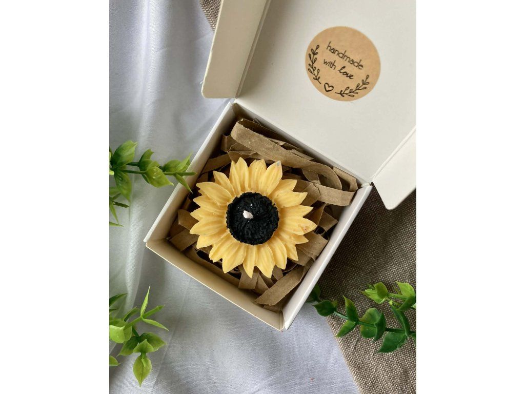 Plovoucí svíčka ve tvaru slunečnice, dárkově zabalená, vyrobená z přírodního sójového vosku. Rozměry krabičky: 6,5 × 6,5 × 3 cm.